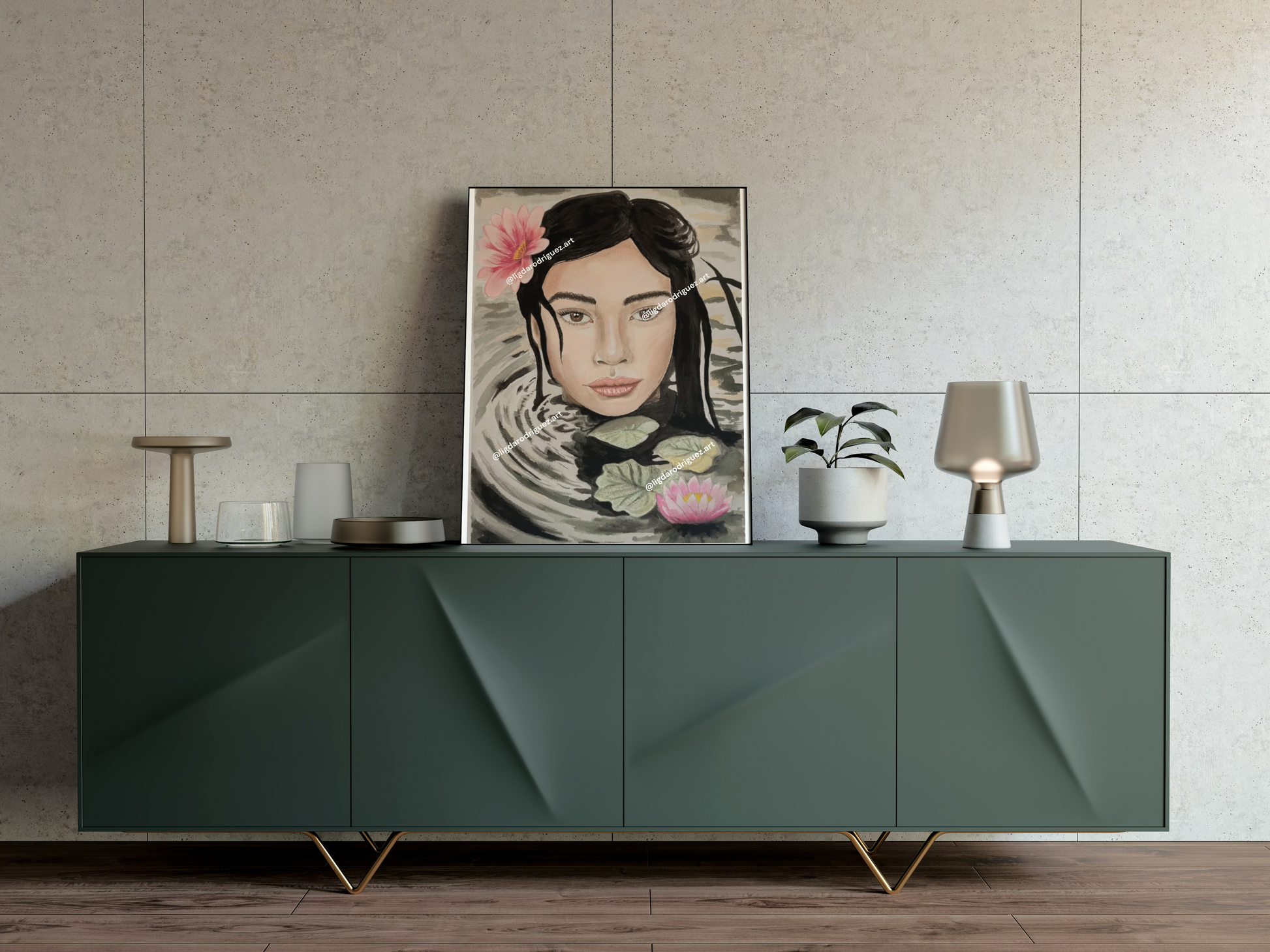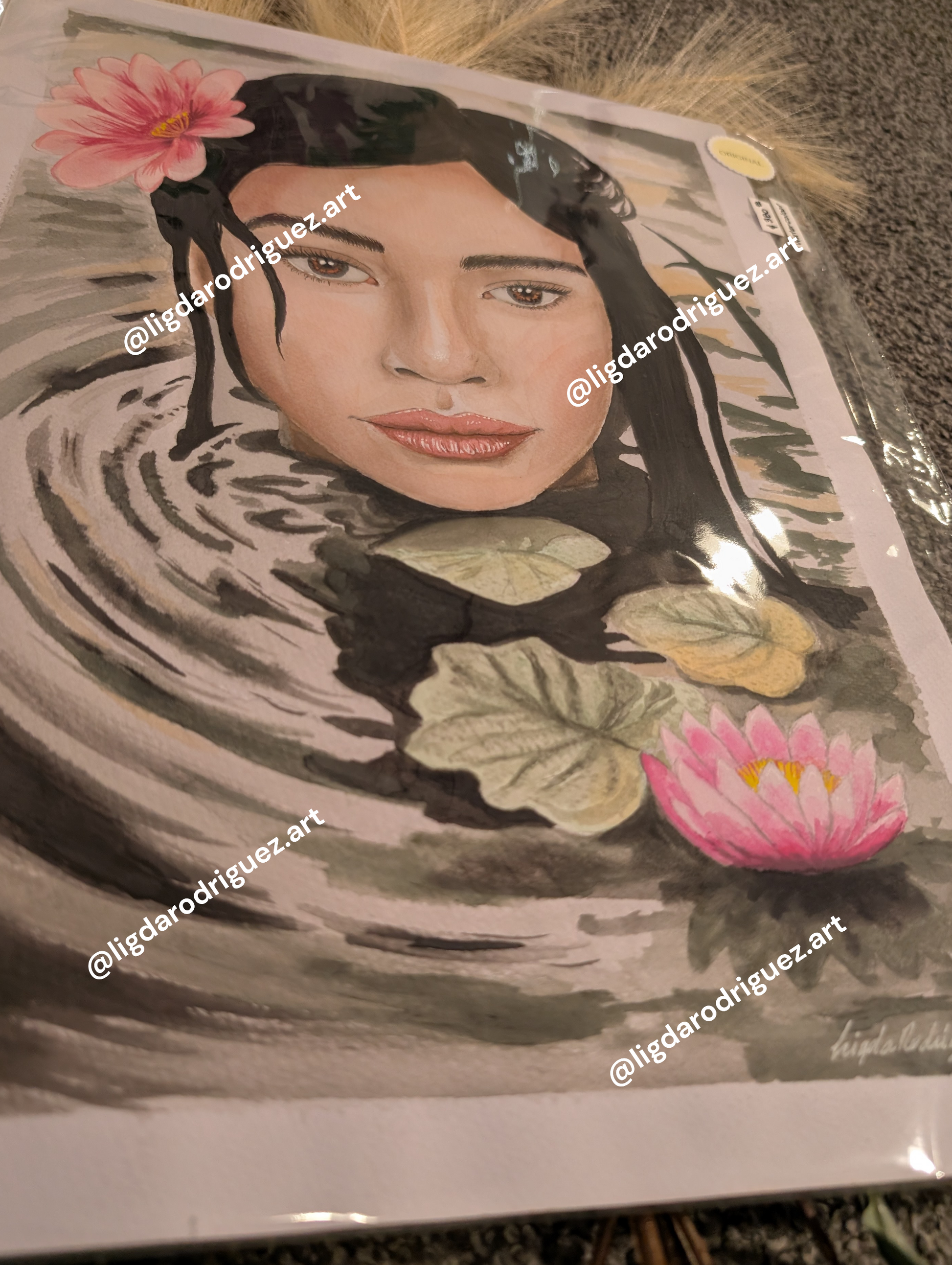 Original watercolour painting on A3 paper featuring a contemplative woman immersed in a serene lake setting. Her dark, wet hair frames her face while a delicate flower adorns her locks, creating a poetic connection between figure and nature.